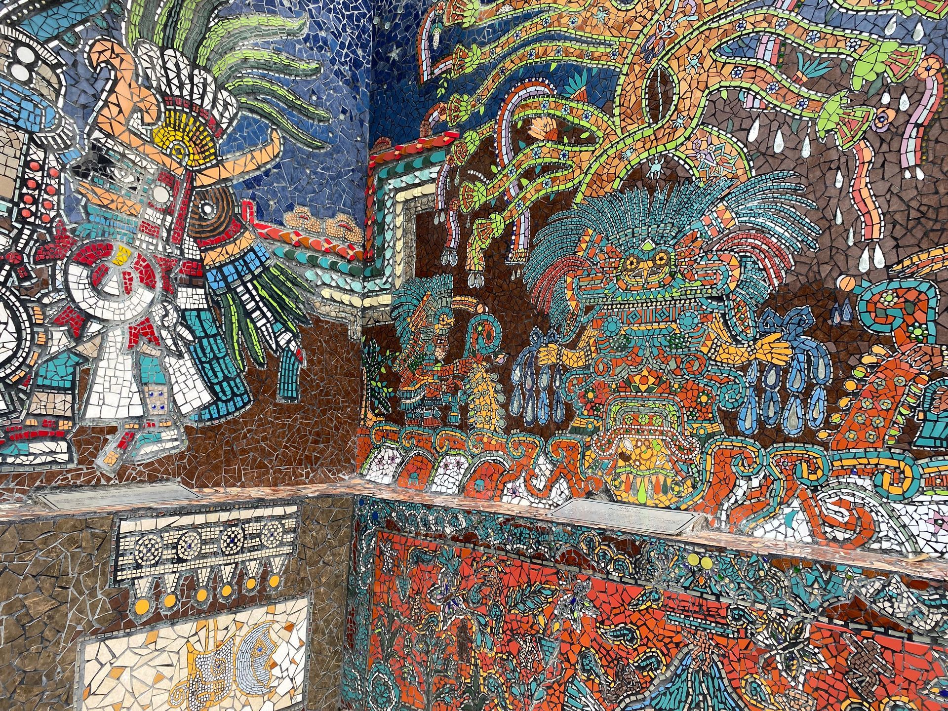 Inspirado en la cosmovisión prehispánica, este mural representa elementos como los 13 cielos, los 9 inframundos y deidades como Quetzalcóatl y Tláloc. Es una muestra del profundo simbolismo ancestral y su influencia en la cultura local.
